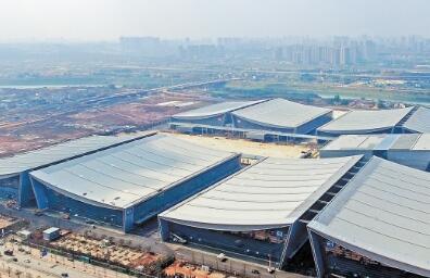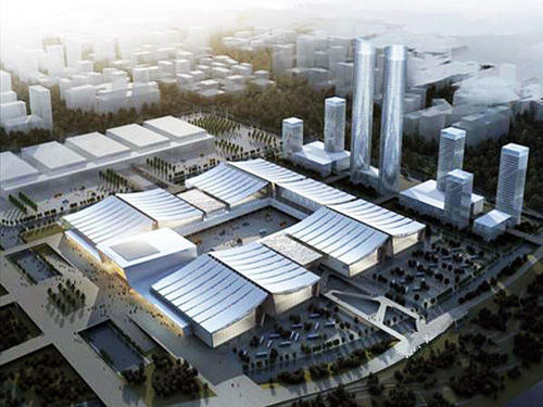 會展中心建筑設計平面共12個展館、2個登陸廳,總建筑面積約43.3萬平方米,其中地上面積約30.1萬平方米,室內凈展示面積約17.75萬平方米,室外凈展示面積約8.5萬平方米,單個展廳面積約1.45萬平方米;場館設置有小轎車停車位3100個,大貨車(大巴)停車位550個,非機動車停車位3200個;場館周邊還規劃了會議中心、賓館酒店、商務樓盤、地鐵及其他站場等各類服務功能設施。
