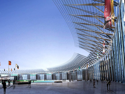 展館區位于世紀城東部、銀杏葉狀的九個展館呈扇形向府南河展開,昭示著成都悠久深厚的文化。11萬平方米的展館結合了德國展館務實和日本展館精致美觀的特點,展廳采用無柱單層結構,最高處凈高21米、最低處12米,堪稱藝術與科技的完美結晶。主館單館面積11000平方米,連接館單館面積800平方米,室內預埋展覽必備的水、電、光纖數據接口等設施設備。呈扇形展開的展館保證了每個展館、每個展位都具有同等的好“口岸”。同時,展館還被賦予了多種功能,可合并在一起滿足各種大型展覽的需要,也可將其分割舉辦諸如大型集會、演唱會、體育比賽等活動。展館區的道路設計也頗具匠心,所有運送參展物品的大型車輛全部從世紀城側到達各展館后面,以保證世紀城內的整潔?!笆兰o城”還為將來的會議、展覽規劃了10000輛地上、地下停車場。
