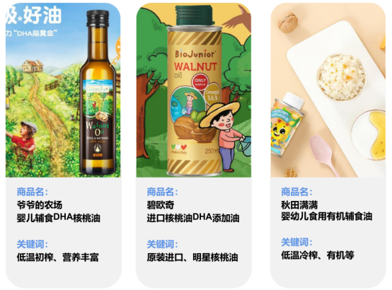 低溫、冷榨、營養是消費者的對產品的認知,以嬰兒輔食專用為主打的核桃油市場競爭激烈,目前領先品牌為爺爺的農場、碧歐奇和秋田滿滿。